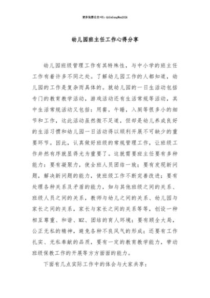 【七哥公文】2025年:【七哥公文】幼儿园班主任工作心得分享+更多免费公文+VX:QiGeGongWen2024+更多免费公文+VX:QiGeGongWen2024