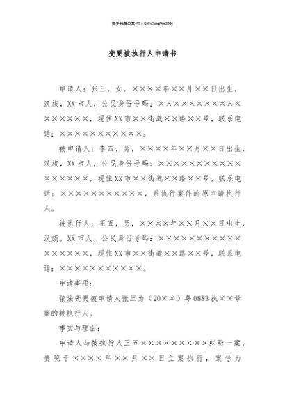 【七哥公文】2025年:【七哥公文】变更被执行人申请书+更多免费公文+VX:QiGeGongWen2024+更多免费公文+VX:QiGeGongWen2024