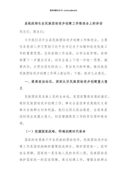 【七哥公文】2025年:【七哥公文】县统战部长在民族团结进步创建工作推进会上的讲话+更多免费公文+VX:QiGeGongWen2024+更多免费公文+VX:QiGeGongWen2024