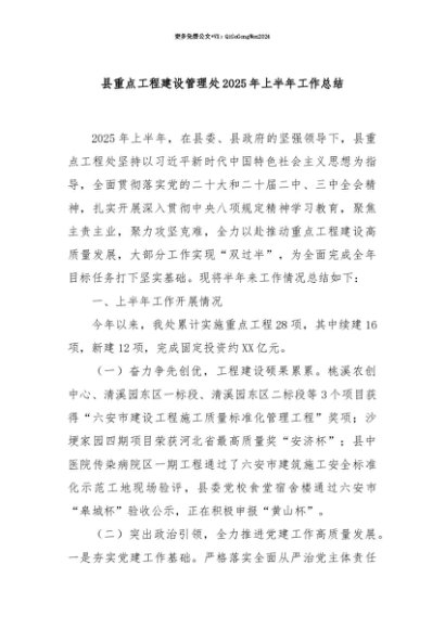 【七哥公文】2025年:【七哥公文】县重点工程建设管理处2025年上半年工作总结+更多免费公文+VX:QiGeGongWen2024+更多免费公文+VX:QiGeGongWen2024