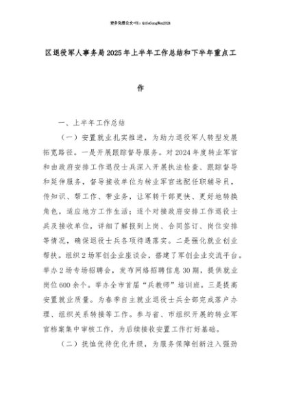 【七哥公文】2025年:【七哥公文】区退役军人事务局2025年上半年工作总结和下半年重点工作+更多免费公文+VX:QiGeGongWen2024+更多免费公文+VX:QiGeGongWen2024