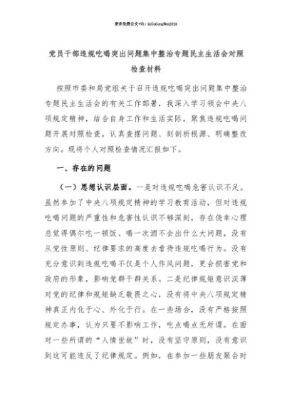 【七哥公文】2025年:【七哥公文】党员干部违规吃喝突出问题集中整治专题民主生活会对照检查材料+更多免费公文+VX:QiGeGongWen2024+更多免费公文+VX:QiGeGongWen2024