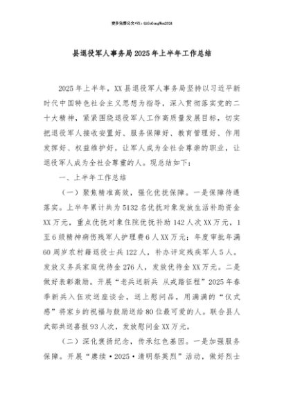 【七哥公文】2025年:【七哥公文】县退役军人事务局2025年上半年工作总结+更多免费公文+VX:QiGeGongWen2024+更多免费公文+VX:QiGeGongWen2024