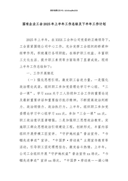【七哥公文】2025年:【七哥公文】国有企业工会2025年上半年工作总结及下半年工作计划+更多免费公文+VX:QiGeGongWen2024+更多免费公文+VX:QiGeGongWen2024