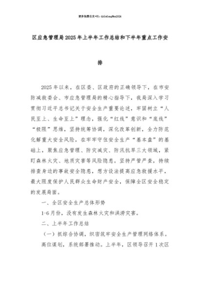 【七哥公文】2025年:【七哥公文】区应急管理局2025年上半年工作总结和下半年重点工作安排+更多免费公文+VX:QiGeGongWen2024+更多免费公文+VX:QiGeGongWen2024