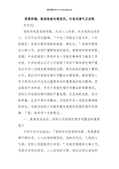 【七哥公文】2025年:【七哥公文】党课讲稿:狠刹违规吃喝歪风,打造风清气正法院+更多免费公文+VX:QiGeGongWen2024+更多免费公文+VX:QiGeGongWen2024