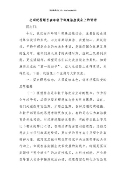 【七哥公文】2025年:【七哥公文】公司纪检组长在年轻干部廉洁座谈会上的讲话+更多免费公文+VX:QiGeGongWen2024+更多免费公文+VX:QiGeGongWen2024