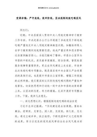 【七哥公文】2025年:【七哥公文】党课讲稿:严守底线,筑牢防线,坚决抵制违规吃喝歪风+更多免费公文+VX:QiGeGongWen2024+更多免费公文+VX:QiGeGongWen2024