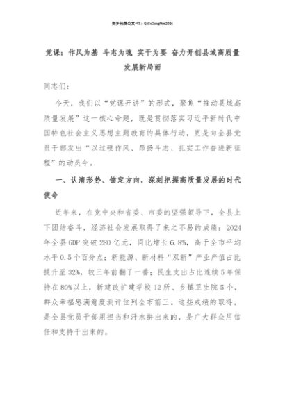 【七哥公文】2025年:【七哥公文】党课:作风为基 斗志为魂 实干为要 奋力开创县域高质量发展新局面+更多免费公文+VX:QiGeGongWen2024+更多免费公文+VX:QiGeGongWen2024