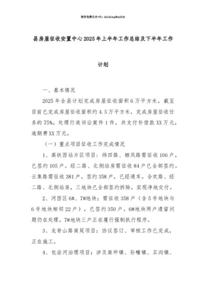 【七哥公文】2025年:【七哥公文】县房屋征收安置中心2025年上半年工作总结及下半年工作计划+更多免费公文+VX:QiGeGongWen2024+更多免费公文+VX:QiGeGongWen2024