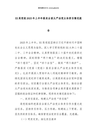 【七哥公文】2025年:【七哥公文】XX局党组2025年上半年落实全面从严治党主体责任情况报告+更多免费公文+VX:QiGeGongWen2024+更多免费公文+VX:QiGeGongWen2024