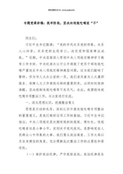 【七哥公文】2025年:【七哥公文】专题党课讲稿:筑牢防线,坚决向违规吃喝说“不”+更多免费公文+VX:QiGeGongWen2024+更多免费公文+VX:QiGeGongWen2024