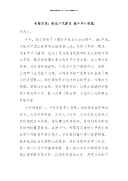 【七哥公文】2025年:【七哥公文】专题党课:强化作风建设 提升审计效能+更多免费公文+VX:QiGeGongWen2024+更多免费公文+VX:QiGeGongWen2024