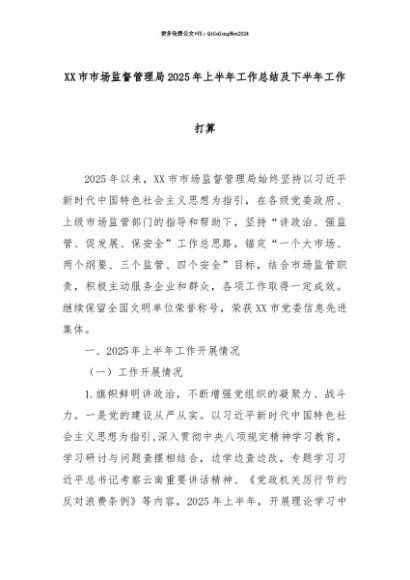 【七哥公文】2025年:【七哥公文】XX市市场监督管理局2025年上半年工作总结及下半年工作打算+更多免费公文+VX:QiGeGongWen2024+更多免费公文+VX:QiGeGongWen2024