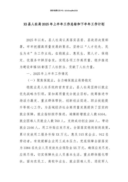 【七哥公文】2025年:【七哥公文】XX县人社局2025年上半年工作总结和下半年工作计划+更多免费公文+VX:QiGeGongWen2024+更多免费公文+VX:QiGeGongWen2024