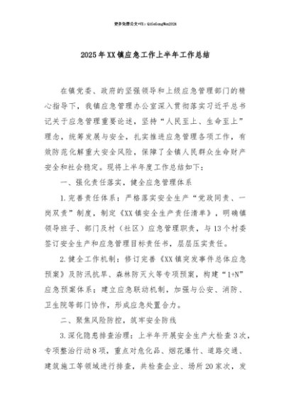 【七哥公文】2025年:【七哥公文】2025年XX镇应急工作上半年工作总结+更多免费公文+VX:QiGeGongWen2024+更多免费公文+VX:QiGeGongWen2024