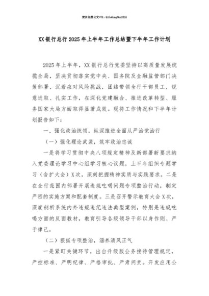 【七哥公文】2025年:【七哥公文】XX银行总行2025年上半年工作总结暨下半年工作计划+更多免费公文+VX:QiGeGongWen2024+更多免费公文+VX:QiGeGongWen2024