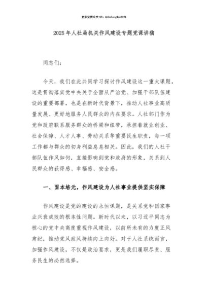 【七哥公文】2025年:【七哥公文】2025年人社局机关作风建设专题党课讲稿+更多免费公文+VX:QiGeGongWen2024+更多免费公文+VX:QiGeGongWen2024