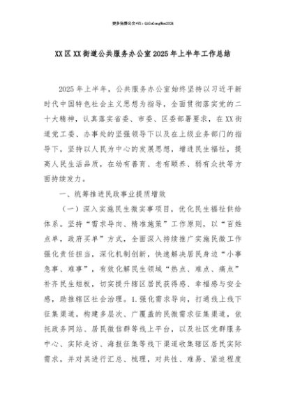 【七哥公文】2025年:【七哥公文】XX区XX街道公共服务办公室2025年上半年工作总结+更多免费公文+VX:QiGeGongWen2024+更多免费公文+VX:QiGeGongWen2024