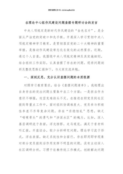 【七哥公文】2025年:【七哥公文】在理论中心组作风建设问题查摆专题研讨会的发言+更多免费公文+VX:QiGeGongWen2024+更多免费公文+VX:QiGeGongWen2024