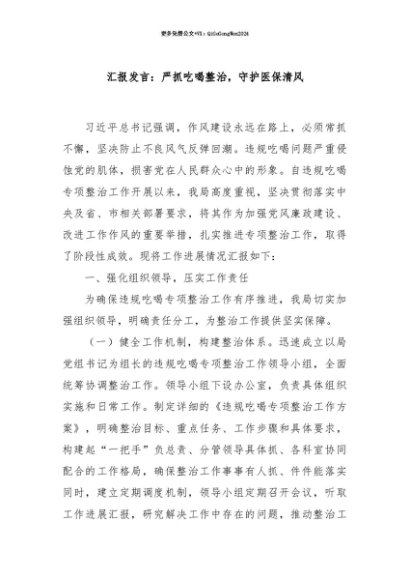 【七哥公文】2025年:【七哥公文】汇报发言:严抓吃喝整治,守护医保清风+更多免费公文+VX:QiGeGongWen2024+更多免费公文+VX:QiGeGongWen2024