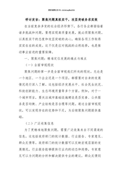 【七哥公文】2025年:【七哥公文】研讨发言:聚焦问题真抓实干,攻坚突破务求实效+更多免费公文+VX:QiGeGongWen2024+更多免费公文+VX:QiGeGongWen2024