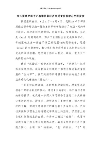 【七哥公文】2025年:【七哥公文】市工商联党组书记助推民营经济高质量发展学习交流发言+更多免费公文+VX:QiGeGongWen2024+更多免费公文+VX:QiGeGongWen2024