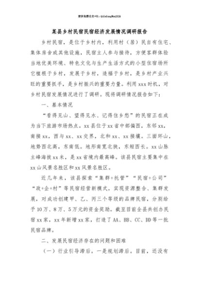 【七哥公文】2025年:【七哥公文】某县乡村民宿民宿经济发展情况调研报告+更多免费公文+VX:QiGeGongWen2024+更多免费公文+VX:QiGeGongWen2024