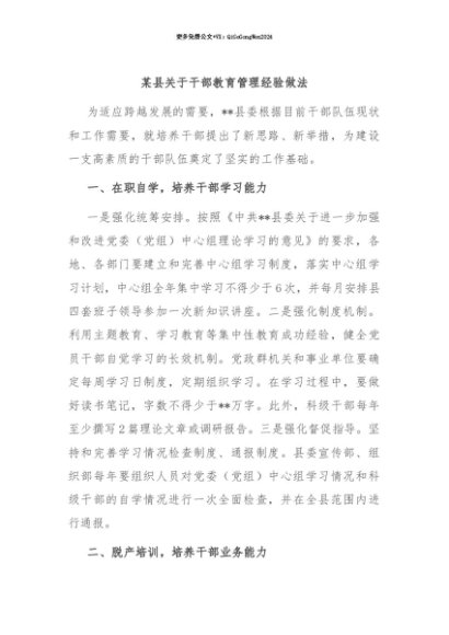 【七哥公文】2025年:【七哥公文】某县关于干部教育管理经验做法+更多免费公文+VX:QiGeGongWen2024+更多免费公文+VX:QiGeGongWen2024