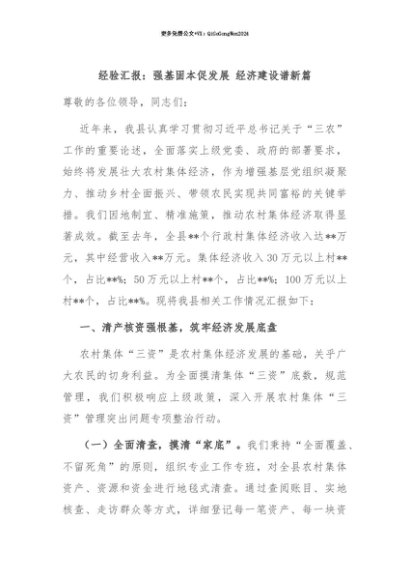 【七哥公文】2025年:【七哥公文】经验汇报:强基固本促发展 经济建设谱新篇+更多免费公文+VX:QiGeGongWen2024+更多免费公文+VX:QiGeGongWen2024
