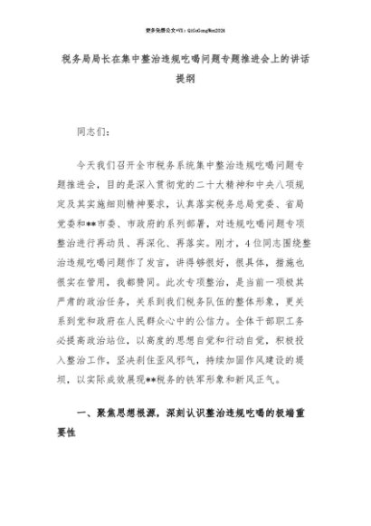 【七哥公文】2025年:【七哥公文】税务局局长在集中整治违规吃喝问题专题推进会上的讲话提纲+更多免费公文+VX:QiGeGongWen2024+更多免费公文+VX:QiGeGongWen2024