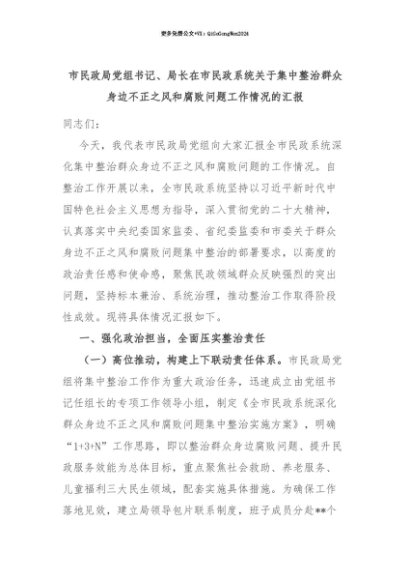【七哥公文】2025年:【七哥公文】市民政局党组书记、局长在市民政系统关于集中整治群众身边不正之风和腐败问题工作情况的汇报+更多免费公文+VX:QiGeGongWen2024+更多免费公文+VX:QiGeGongWen2024