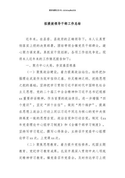 【七哥公文】2025年:【七哥公文】拟提拔领导干部工作总结+更多免费公文+VX:QiGeGongWen2024+更多免费公文+VX:QiGeGongWen2024