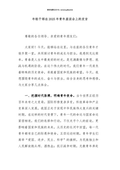 【七哥公文】2025年:【七哥公文】年轻干部在2025年青年座谈会上的发言+更多免费公文+VX:QiGeGongWen2024+更多免费公文+VX:QiGeGongWen2024