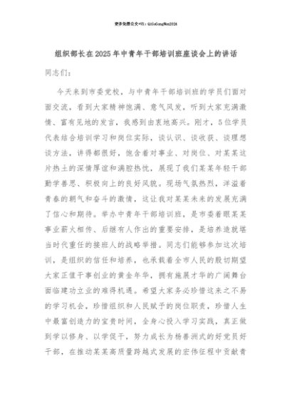 【七哥公文】2025年:【七哥公文】组织部长在2025年中青年干部培训班座谈会上的讲话+更多免费公文+VX:QiGeGongWen2024+更多免费公文+VX:QiGeGongWen2024