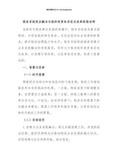【七哥公文】2025年:【七哥公文】税务系统党业融合与组织岗责体系优化改革经验材料+更多免费公文+VX:QiGeGongWen2024+更多免费公文+VX:QiGeGongWen2024