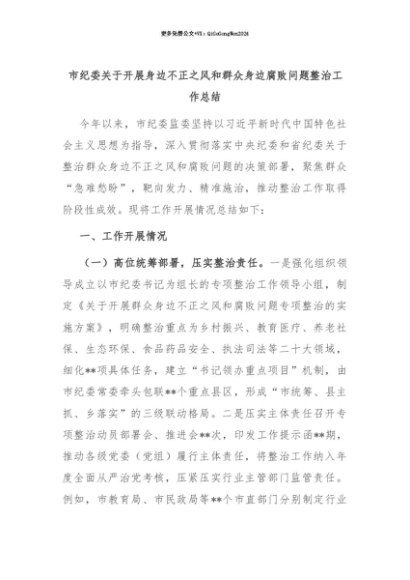 【七哥公文】2025年:【七哥公文】市纪委关于开展身边不正之风和群众身边腐败问题整治工作总结+更多免费公文+VX:QiGeGongWen2024+更多免费公文+VX:QiGeGongWen2024