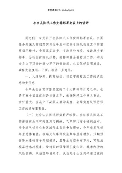 【七哥公文】2025年:【七哥公文】在全县防汛工作安排部署会议上的讲话+更多免费公文+VX:QiGeGongWen2024+更多免费公文+VX:QiGeGongWen2024