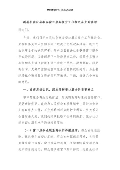 【七哥公文】2025年:【七哥公文】副县长在社会事务窗口服务提升工作推进会上的讲话+更多免费公文+VX:QiGeGongWen2024+更多免费公文+VX:QiGeGongWen2024