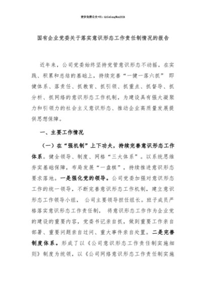 【七哥公文】2025年:【七哥公文】国有企业党委关于落实意识形态工作责任制情况的报告+更多免费公文+VX:QiGeGongWen2024+更多免费公文+VX:QiGeGongWen2024