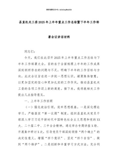 【七哥公文】2025年:【七哥公文】县直机关工委2025年上半年重点工作总结暨下半年工作部署会议讲话材料+更多免费公文+VX:QiGeGongWen2024+更多免费公文+VX:QiGeGongWen2024