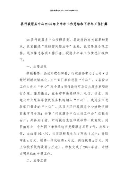 【七哥公文】2025年:【七哥公文】县行政服务中心2025年上半年工作总结和下半年工作打算+更多免费公文+VX:QiGeGongWen2024+更多免费公文+VX:QiGeGongWen2024