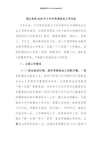 【七哥公文】2025年:【七哥公文】国企党委2025年上半年思想政治工作总结+更多免费公文+VX:QiGeGongWen2024+更多免费公文+VX:QiGeGongWen2024