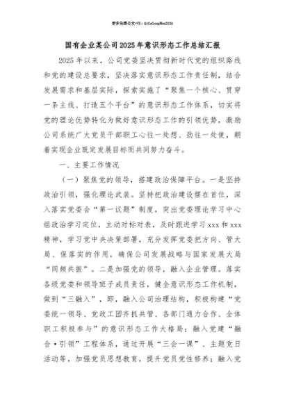 【七哥公文】2025年:【七哥公文】国有企业某公司2025年意识形态工作总结汇报+更多免费公文+VX:QiGeGongWen2024+更多免费公文+VX:QiGeGongWen2024