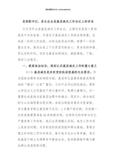 【七哥公文】2025年:【七哥公文】县委副书记、县长在全县基层减负工作会议上的讲话+更多免费公文+VX:QiGeGongWen2024+更多免费公文+VX:QiGeGongWen2024
