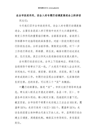 【七哥公文】2025年:【七哥公文】在全市改进作风、访企入村专题行动调度推进会上的讲话+更多免费公文+VX:QiGeGongWen2024+更多免费公文+VX:QiGeGongWen2024