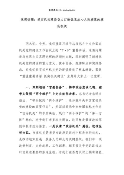 【七哥公文】2025年:【七哥公文】党课讲稿:抓实机关建设奋力打造让党放心人民满意的模范机关+更多免费公文+VX:QiGeGongWen2024+更多免费公文+VX:QiGeGongWen2024
