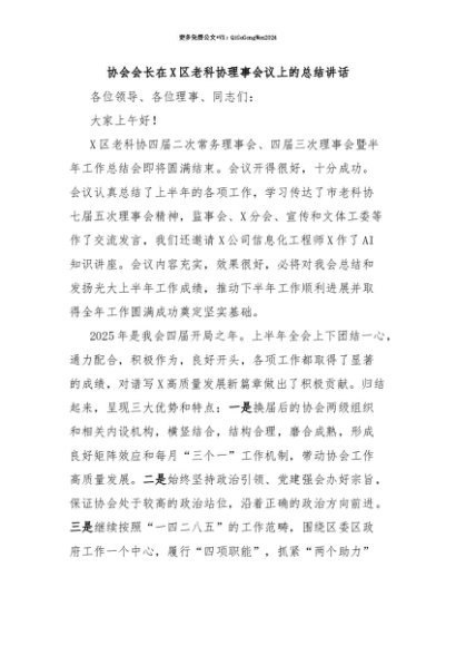 【七哥公文】2025年:【七哥公文】协会会长在X区老科协理事会议上的总结讲话+更多免费公文+VX:QiGeGongWen2024+更多免费公文+VX:QiGeGongWen2024