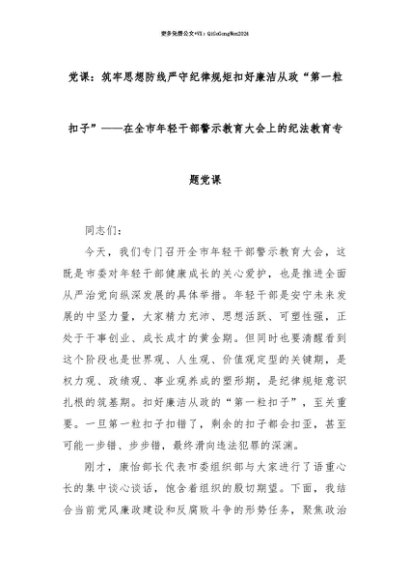 【七哥公文】2025年:【七哥公文】党课:筑牢思想防线严守纪律规矩扣好廉洁从政“第一粒扣子”——在全市年轻干部警示教育大会上的纪法教育专题党课+更多免费公文+VX:QiGeGongWen2024+更多免费公文+VX:QiGeGongWen2024