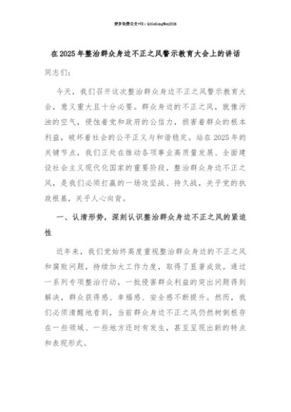 【七哥公文】2025年:【七哥公文】在2025年整治群众身边不正之风警示教育大会上的讲话+更多免费公文+VX:QiGeGongWen2024+更多免费公文+VX:QiGeGongWen2024